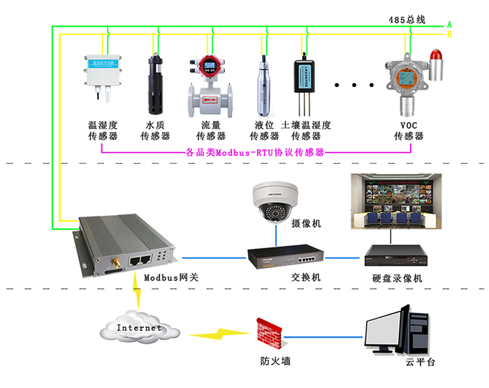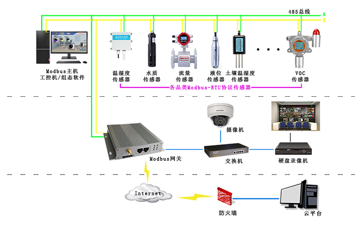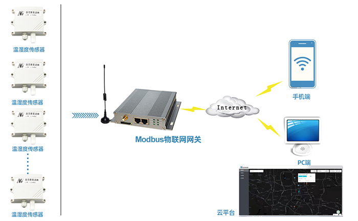 一些场所对温湿度要求十分严格,恩易modbus物联网网关可以将采集到的温湿度信息,上报至管理平台,超标报警,方便工作人员管理。应用Modbus网关数据上报功能。