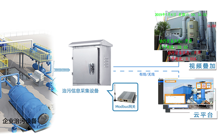 治污设备状态监控箱通过监测设备运行状态,判断治污设备是否正常运行,提高监管效率。应用Modbus网关4G数据上报、字符叠加功能。