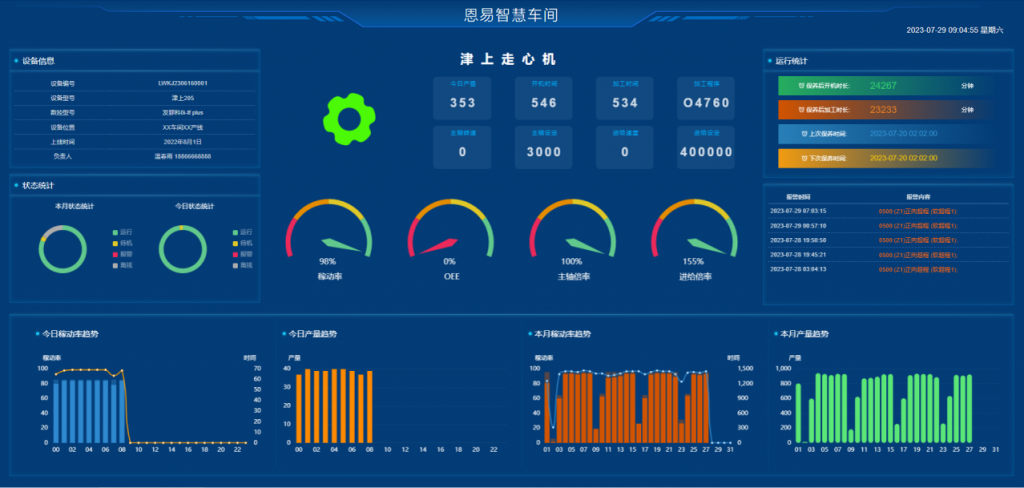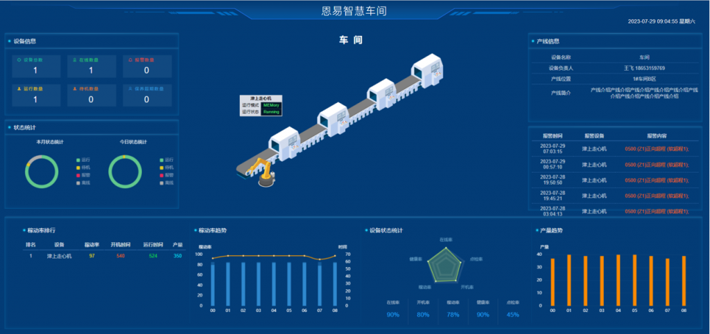 系统可实时采集生产设备运行状态、加工参数、生产环境数据、生产能耗数据等,通过车间大屏、电脑端、手机端等多种途径展示给管理人员,帮助各级管理人员实时掌控车间生产情况,提高企业信息透明度和管理水平。