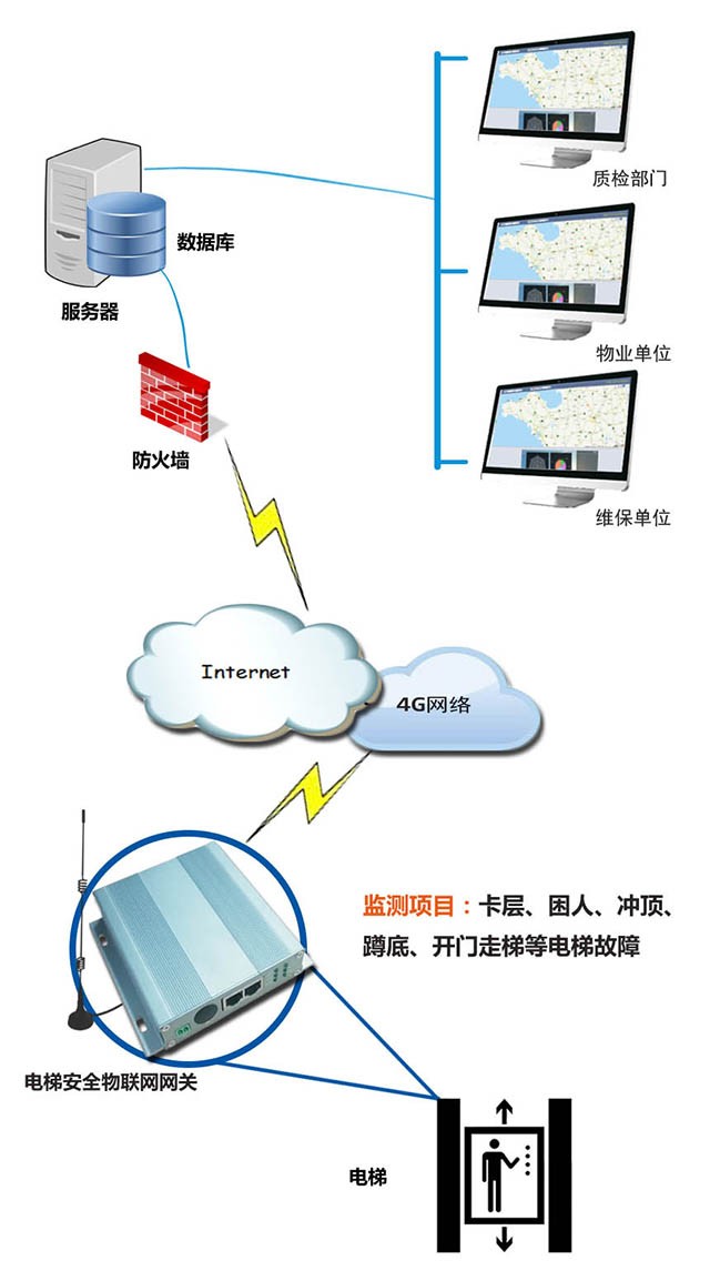 电梯内外会安装一些传感器,轿厢顶的电梯安全物联网网关负责将传感器收集的电梯信息传输到一个统一的电梯运行管理平台,质监局、物业用户和维保单位可以通过互联网终端及时了解电梯的运行状况。电梯安全物联网网关通过分析处理电梯运行状态信息,判断电梯是否发生困人,并将电梯困人信息发送出去,电梯安全报警会实现电梯故障主动告警。