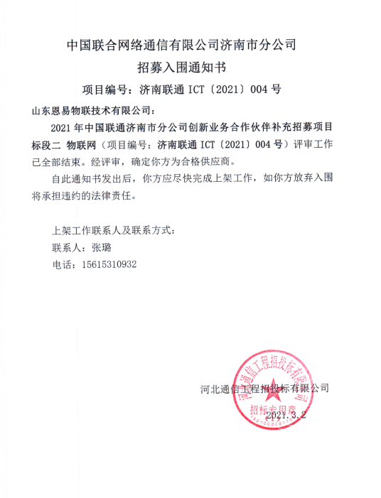 此次投标山东时搏网页版登录入口领导十分重视,对投标文件、技术质量都进行了明确的要求,因为时间紧任务重,在领导的带领下,各部门同事团结合作加班加点、共同努力,高效的完成了编制投标文件的任务,最终,山东时搏网页版登录入口赢得了中国联通济南分公司的肯定,顺利中标,为山东时搏网页版登录入口今后的发展打下坚实的基础。