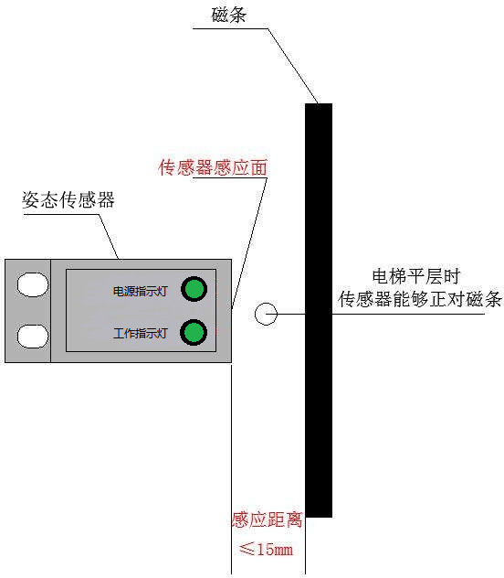 姿态传感器在出厂时,接口已经压制完成,只需插上接口就可使用,如需调整线序注意电源不可接反。在安装时将姿态传感器的感应面作为前端面,立式安装,当电梯正常平层时姿态传感器能够正对所要感应的磁条,传感器与磁条的距离应当小于15mm。