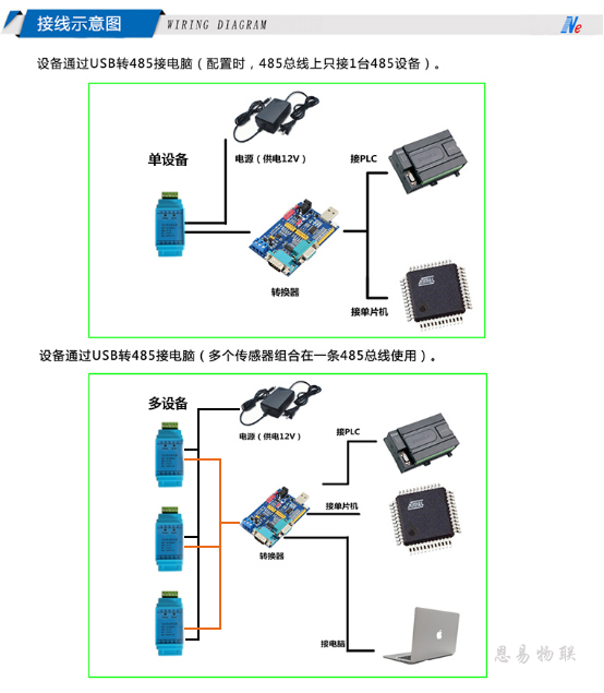 恩易交流电流变送器可以连接单独使用,首先使用 12V 直流电源供电,设备可以直接连接带有 485 接口的 PLC,可以通过485 接口芯片连接单片机。通过后文指定的 MODBUS 协议对单片机和 PLC 进行编程即可配合传感器使用。同时使用USB 转 485 即可与电脑连接,使用我公司提供的传感器配置工具进行配置和测试。