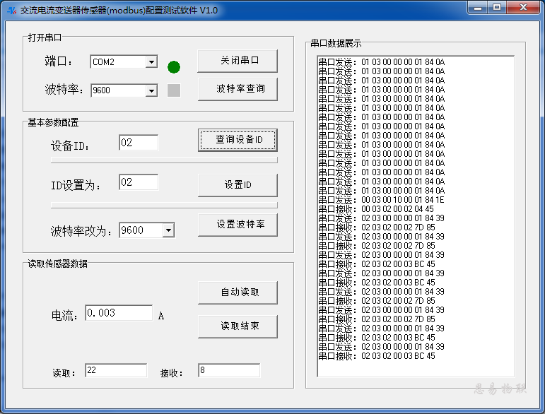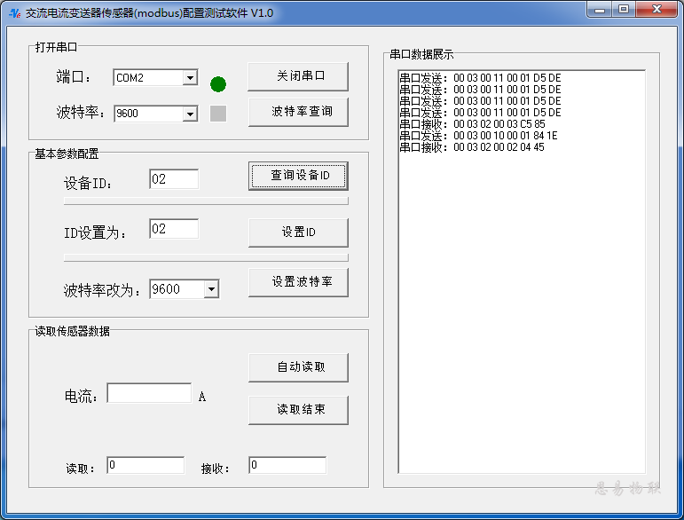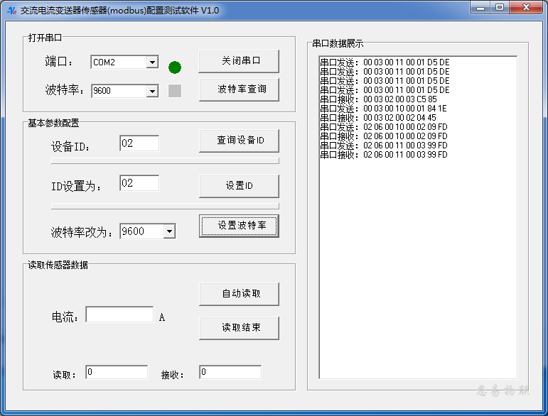 ③、打开“交流电流变送器传感器(modbus)配置测试软件 V1.0.exe”,单台传感器通过USB转485接电脑并上电,点击“打开串口”,待端口灯变绿,点击“波特率查询和查询设备ID”,此时软件会自动测出当前设备ID和波特率(默认ID:01,波特率:9600)。
