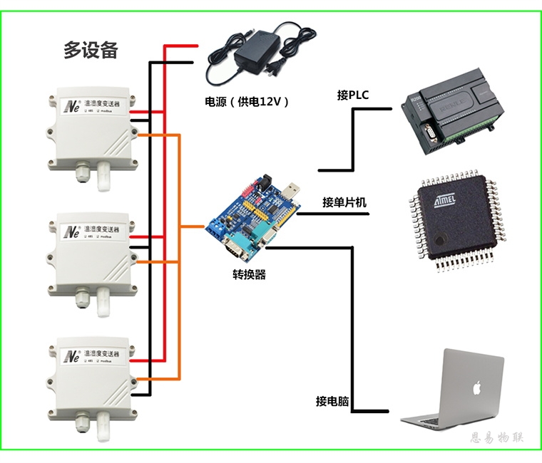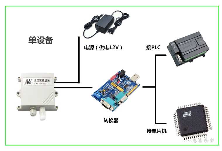 485型温湿度变送器可以连接单独使用,首先使用 12V 直流电源供电,设备可以直接连接带有 485 接口的 PLC,可以通过485 接口芯片连接单片机。通过后文指定的 MODBUS 协议对单片机和 PLC 进行编程即可配合传感器使用。同时使用USB 转 485 即可与电脑连接,使用我公司提供的传感器配置工具进行配置和测试。