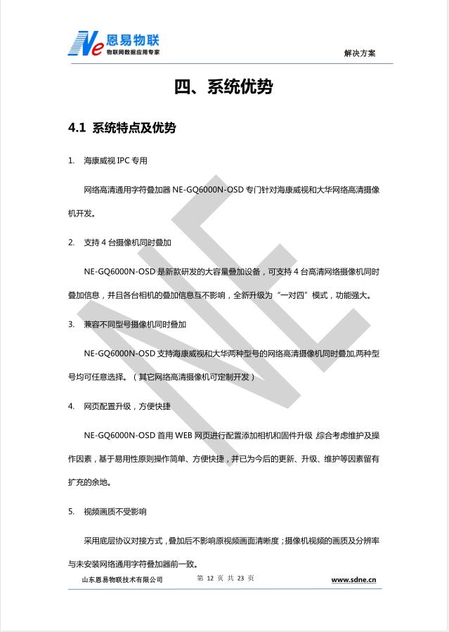 NE-GQ6000N-OSD连接网络高清摄像机和充电桩,把气象监测因子空气温湿度、风速风向、光照等气象数据和计量计费、电压电流等充电桩数据实时同步显示在后台监控视频画面上,使数据和视频融为一体,增强整个安防系统的紧密互联性,构建统一的监控管理系统。并且数据一旦叠加无法修改,解决了事故究责的麻烦,真正实现可视、可管、可控的安防管理,满足系统集成商、投资商、业主等不同用户层级对电站的安防监控需求。并且该设备具有灵活的叠加配置和升级功能,使后期各类数据叠加扩展得以实现。