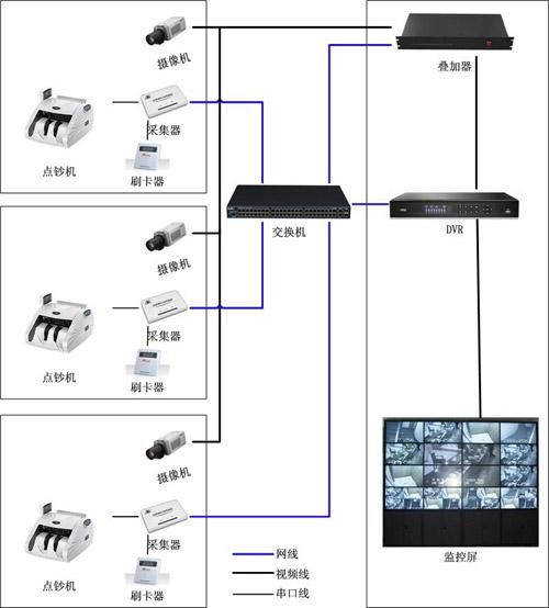 目前,各家银行已被要求必须安装视频监控系统;银行交易中,一旦产生纠纷事件,视频录像就成为了解决纠纷的主要依据,而通过视频录像只能看出当时的人员动作情况,针对当时具体的钞票交易张数或银行卡帐号则无法查看到;解决纠纷事件依然显得非常复杂和困难。银行柜员机信息叠加查询系统通过数据采集器及字符叠加设备可将点钞机外显屏的信息与视频画面进行处理成为一个新的视频信号 ;新的视频信号可保存到硬盘录像机中,在日后调取视频录像时即可在视频画面上看到当时的交易信息及银行卡帐号信息。