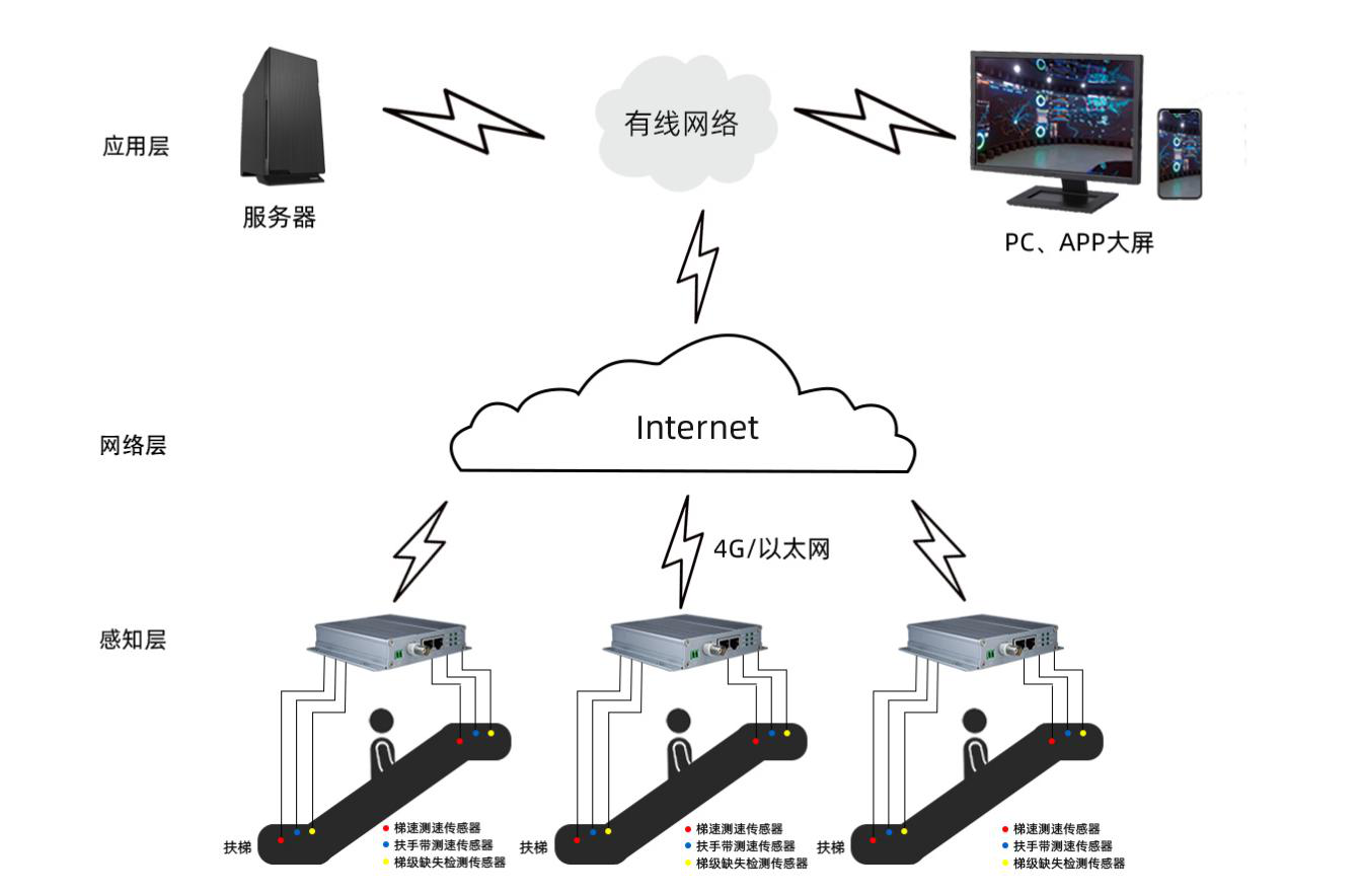扶梯信息采集叠加器通过传感器组、检测开关(上图只列出了传感器组)、监测扶梯梯速、扶手带速度、梯级缺失,通过AI识别摄像头采集乘客摔倒挤压,裙边夹人,梯级踏板夹人等扶梯状态信息和乘客事故并进行整合分析处理,将分析处理后的有效信息发送到安全报警主机并在显示器、大屏上实时展现。
