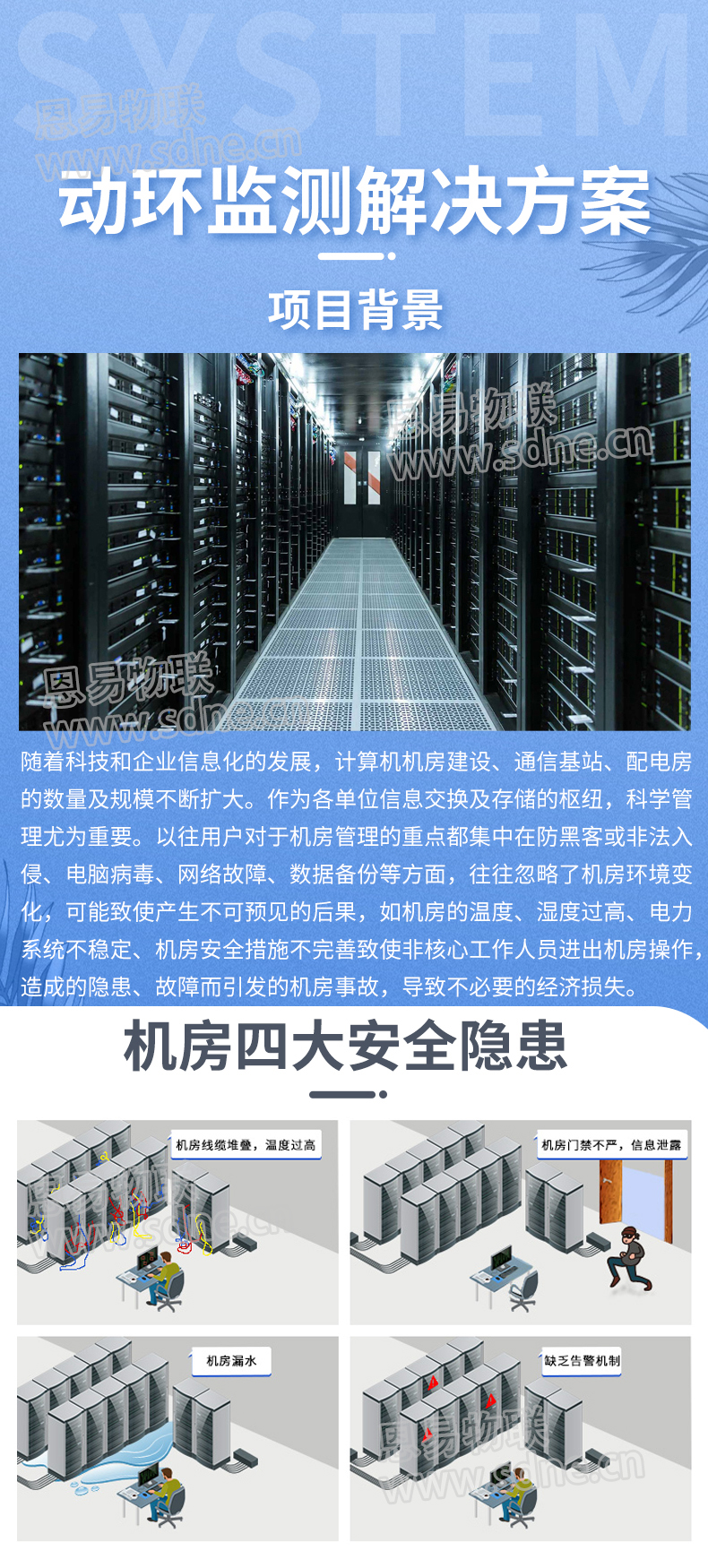 能够实现机房温湿度监测、精密空调监测、烟雾监测、漏水监测等功能,还能在监控 界面以图形方式直观呈现。当监测数据超过安全范围时,系统将立即发送报警,为机 房打造更安全的运维环境。