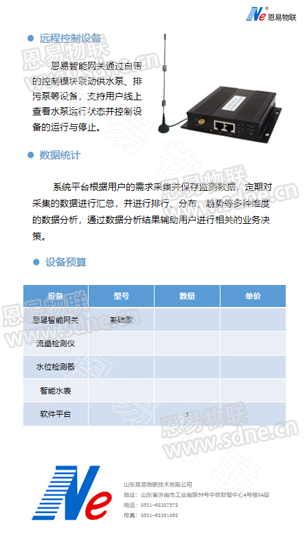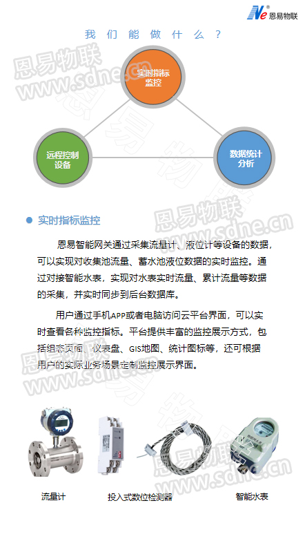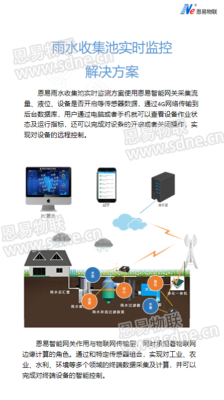 恩易雨水收集池实时监测方案使用恩易智能网关采集流量、液位、设备是否开启等传感器数据,通过4G网络传输到后台数据库,用户通过电脑或者手机就可以查看设备作业状态及运行指标,还可以完成对设备的开启或者关闭操作,实现对设备的远程控制。