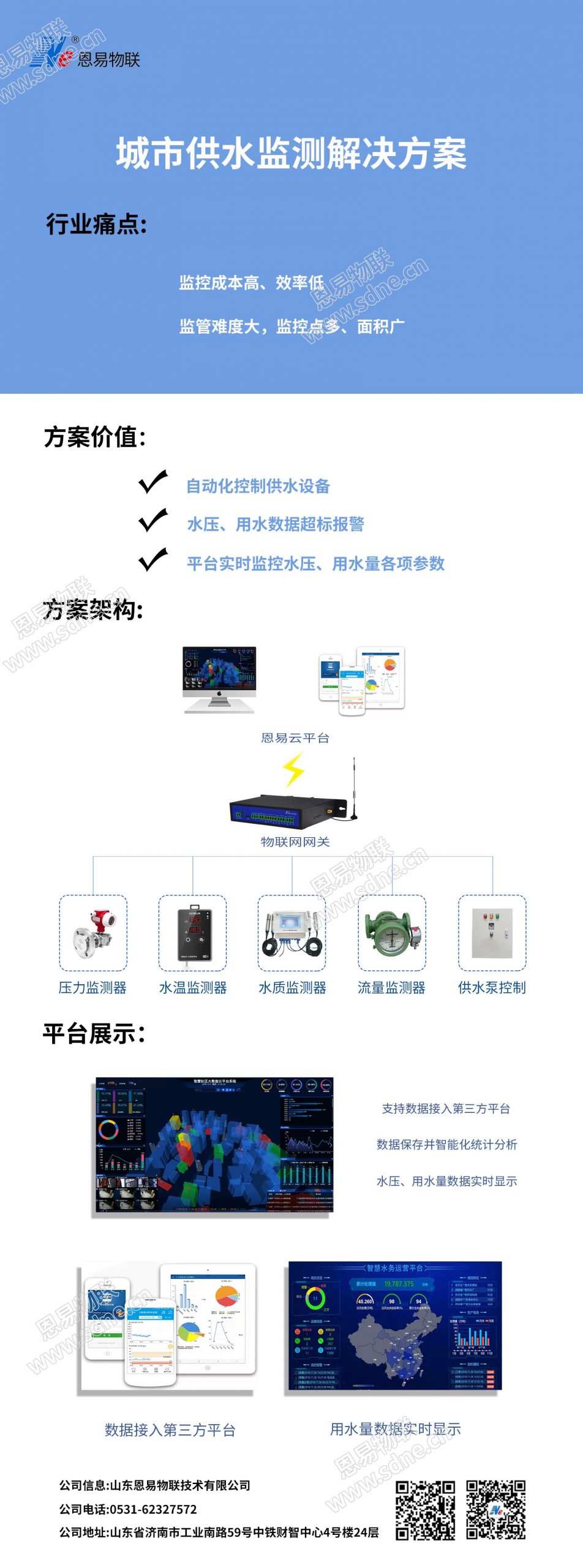 城市供水监测解决方案 物联网应用技术 | 2021年10月29日 | 物联网应用解决方案 城市供水监测解决方案可实现自动控制供水设备实时监测水压、用水数据、根据监测数据实现数据超标报警等功能,实时感知供水设备以及远程控制。 想要了解更多解决方案,欢迎拨打:0531-62327572