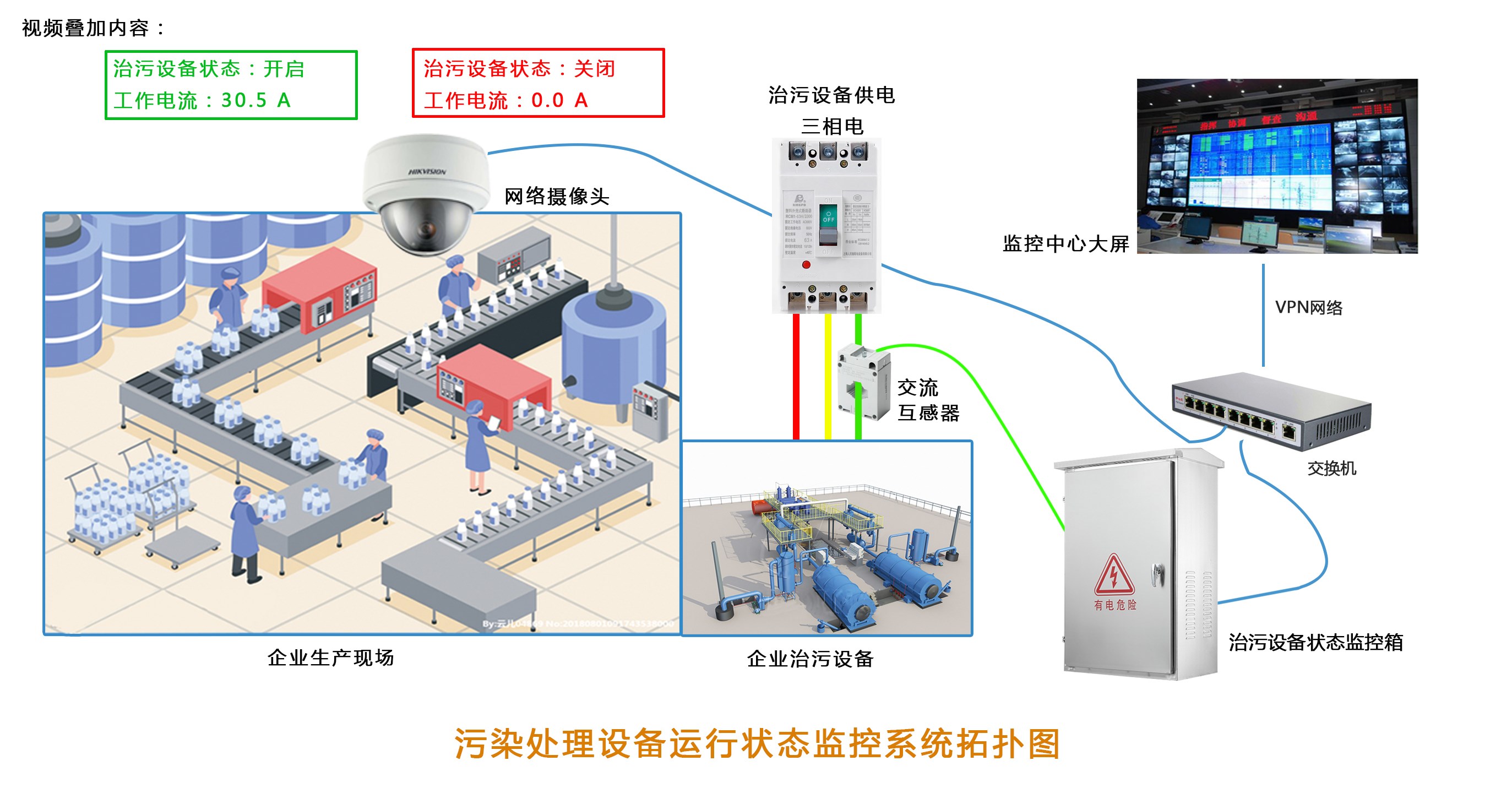 1.数据实时展示:设备电流、运行状态实时显示在视频监控画面上,方便管理部门提升监管效率;