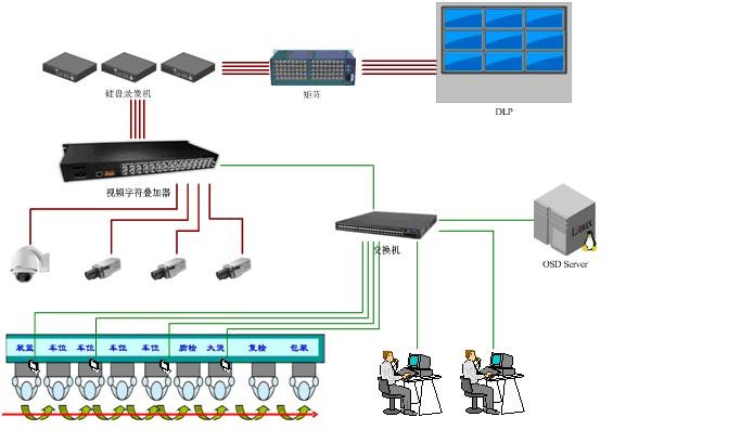2、 生产信息叠加部分:该部分由视频字符叠加器(NE-POS-9016N)、信息视频管理服务器(OSD Server)、管理终端计算机构成,实现生产数据与。视频的融合、生产数据存储及根据数据查询监控视频等功能