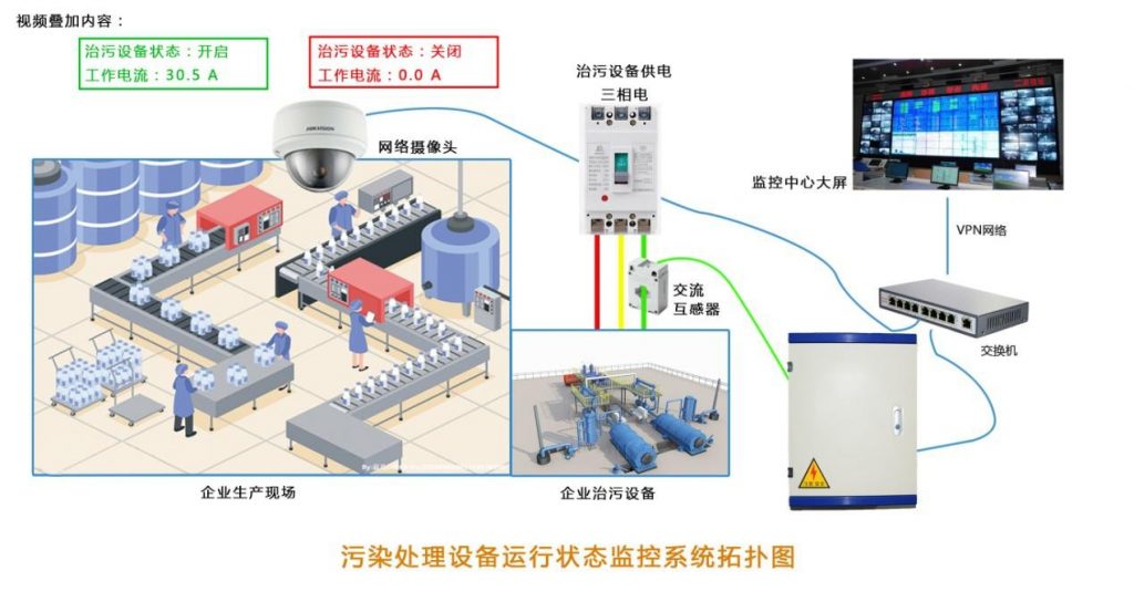 利用NE 配电箱设备实现上下衔接,使用创新的物联网电力传感技术,实时采集环保治理设备用电数据,通过关联分析、电流分析,及时发现环保治理设备未开启、异常关闭等设备。并通过视频物联网技术,将电流数据、设备运行状态(开启/关闭)在监控视频画面上同步显示。方便监管部门和企业及时发现环保设备异常,提升巡查效率,降低巡查成本。