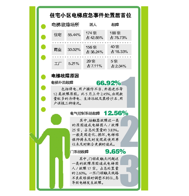 据广州市电梯安全运行监控中心最新发布,6月份全市发生困人事件408宗,解救被困人员总计1147人,平均每天每万台电梯发生困人事件1.29宗。408宗困人事件中,由于电梯使用管理不善原因(如生活垃圾、停电和用户操作不当等)造成的困人事件276宗,环比5月份上升了3.7%。救援人员到达现场平均用时12.3分钟,比国家规定的30分钟大幅度缩短59%;现场实施救援平均用时7分钟。