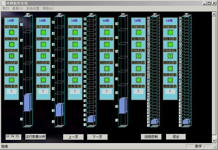 整个系统由主控制器、电梯控制屏(DDC)、显示装置(CRT)、打印机、远程操作台及串行通讯网络组成。主控制器以32位微机为核心,一般为CPU 冗余结构,因而可靠性较高,它与设在各电梯机房的控制屏进行串行通信,对各电梯监控。 采用高清晰度的大屏幕彩色显示器,监视、操作都很方便。主控制器与上位计算机(或BMS 系统)及安全系统具有串行通信功能,以便与 BAS形成整体。系统具有较强的显示功能,除了正常情况下显示各电梯的运行状态之外,当发生灾害或故障时,用专用画面代替正常显示图面,并且当必须管制运行或发生异常时,能把操作顺序和必要的措施显示在图面上,因此可迅速地处理灾害和故障,提高对电梯的监控能力。