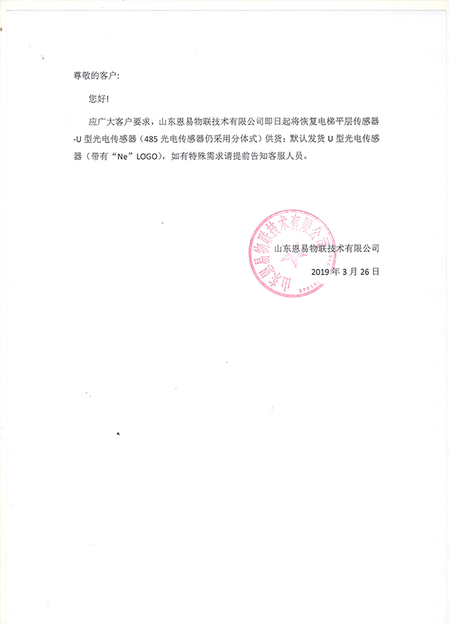关于恢复电梯平层传感器-U型光电传感器供货通知 syj | 2019年3月26日 | 行业资讯 应广大客户要求,山东时搏网页版登录入口技术有限公司即日起将恢复电梯平层传感器-U型光电传感器(485光电传感器仍采用分体式)供货;默认发货U型光电传感器(带有“Ne”LOGO),如有特殊需求请提前告知客服人员。