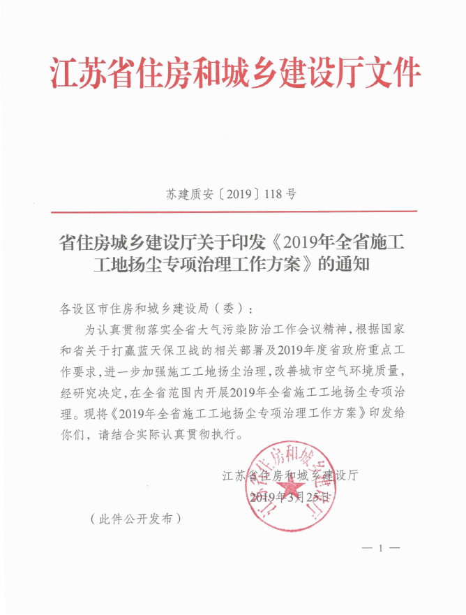 江苏省住房和城乡建设厅提出2019年全省施工工地扬尘专项治理工作方案;工作目标扎实开展施工工地扬尘专项治理,进一步落实参建各方主体责任和政府监管责任,完善扬尘控制责任制度。严格落实“六个百分之百”要求,实现工地喷淋、洒水抑尘设施全面覆盖,积极推进绿色工地建设,提高全省建筑施工标准化管理水平。