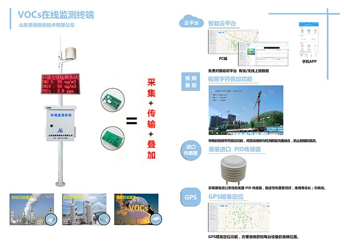 山东恩易VOCs在线监测终端是一款用于挥发性有机化合物准确监测的产品。VOCs在线监测终端能够实现无组织排放的挥发性有机物(VOCs)在线监测、并实时传送至环境监测平台,本产品特有视频叠加功能,采用原装进口高性能英国 PID 传感器,稳定性和重复性好,使用寿命长;功耗低。