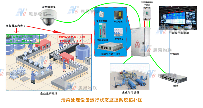 山东恩易依托创新的物联网电力传感技术,实时采集环保治理设备用电数据,通过关联分析、电流分析,及时发现环保治理设备未开启、异常关闭等设备。并通过视频物联网技术,将电流数据、设备运行状态(开启/关闭)在监控视频画面上同步显示。方便监管部门和企业及时发现环保设备异常,提升巡查效率,降低巡查成本。